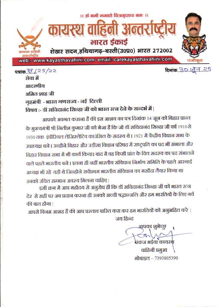 आगे पत्र में कायस्थ वाहिनी अंतर्राष्ट्रीय के प्रमुख पंकज भईया कायस्थ ने माँग करते हुए लिखा कि डॉ सच्चिदानंद सिन्हा जी को भारत रत्न देर से ही सही अब प्रदान करना ही उनको सच्ची श्रद्धांजलि होगी ।
